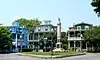The Cape May Historic District is an area of 380 acres (1.5 km2) with over 600 buildings in the resort town of Cape May, Cape May County, New Jersey. The city claims to be America's first seaside resort and has numerous buildings in the Late Victorian style, including the Eclectic, Stick, and Shingle styles, as well as the later Bungalow style, many with gingerbread trim. According to National Park Service architectural historian Carolyn Pitts, "Cape May has one of the largest collections of late 19th century frame buildings left in the United States... that give it a homogeneous architectural character, a kind of textbook of vernacular American building."[4]