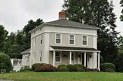 The Captain Samuel Woodruff House is located east of Southington's town center, facing north on the south side of Old State Road, an old alignment of the main Berlin road, which now passes just south of the property. It is a 2+1⁄2-story wood-frame structure, roughly square in shape, with a hip roof, central chimney, and clapboarded exterior. The main facade is three bays wide, with wide pilasters at the corners rising to an entablature. The main entrance is in the rightmost bay, framed by sidelight and transom windows. A single-story porch extends across the front facade, supported by plain square posts. There are single-story extensions to the rear and side of the main block. Interior features include an original staircase with Greek Revival details, wooden panels below parlor windows, and original doors and hardware. The property includes a number of smaller early 20th-century outbuildings.[2]