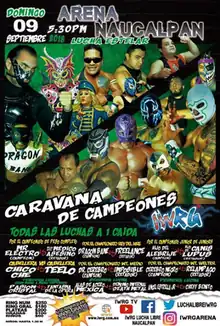 Professional wrestling has a long running tradition of holding shows that feature several championship matches, and at times actually promoting shows as an "all championship matches" shows. The earliest documented "All-Championship" show is the EMLL Carnaval de Campeones ("Carnival of Champions") held on January 13, 1965.[2] In 2007, WWE held a pay-per-view called Vengeance: Night of Champions, making WWE Night of Champions a recurring theme.[3] Starting in 2008, the Mexican lucha libre promotion International Wrestling Revolution Group (IWRG) has held a regular major show labeled Caravana de Campeones, Spanish for "Caravan of Champions" using the same concept for a major annual show.[4] All Caravana de Campeones shows have been held in Arena Naucalpan, IWRG's home arena, the location of all of their major shows through the years. The 2015 show was the ninth time IWRG has held a Caravana de Campeones show, having not held one in 2010 but held twice in both 2012 and 2013.[5][6][7][8] IWRG held a Caranana show in October 2015,[9] skipped the show in 2016,[10][11] and then held another in October 2017. The 2018 version of the Caravana de Campeones was the 11th overall show under the name.