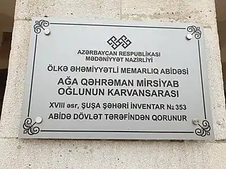 Caravanserai of Agha Gahraman Mirsiyab Oghlu(Azerbaijani: Ağa Qəhrəman Mirsiyab oğlunun karvansarası) also known as the Masjidli Caravanserai, is located at 31 M.F. Akhundov Street in the city of Shusha.[1][2] The caravanserai has been registered as an important historical and cultural monument of the country by the Ministry of Culture and Tourism of the Republic of Azerbaijan.