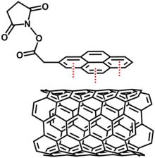 Some common polynuclear aromatic compounds that are functionalized with hydrophilic or hydrophobic moieties are used to solubilize carbon nanotubes into organic or aqueous solvents. Some of these amphiphiles are phenyl, naphthalene, phenanthrene, pyrene and porphyrin systems.[45] The greater π-π stacking of aromatic amphiphiles such as pyrene amphiphiles had the best solubility compared to phenyl amphiphiles with the worse π-π stacking, lead to more solubility in water.[45] These aromatic systems can be modified with amino and carboxylic acid groups prior to functionalizing the carbon nanotubes.[46]