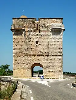 The road once crossed the tower, by a door defended by a portcullis and surmounted by a low arch. The base and the top of the southern and northern facades are pierced with two large loopholes. The parapet of the platform which surmounts the tower has a single niche on each face and a watchtower at each angle.