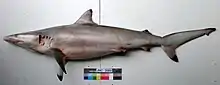 The spinner shark was originally described as Carcharias (Aprion) brevipinna by Johannes Peter Müller and Friedrich Gustav Jakob Henle in their 1839 Systematische Beschreibung der Plagiostomen, based on the mounted skin of a 79-cm-long specimen collected off Java.[2] This species was subsequently moved to the genera Aprion, Squalus, and Aprionodon before being placed within the genus Carcharhinus.[3] The tooth shape and coloration of this species varies significantly with age and between geographical regions, which caused much taxonomic confusion.[2] Other common names include black-tipped shark, great blacktip shark, inkytail shark, large blacktip shark, long-nose grey shark, longnose grey whaler, and smoothfang shark.[4]