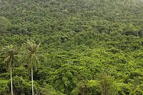Dwarf rain forests occupy waterlogged areas in the southern slopes of the mountains, with the tree canopy not exceeding 12 meters in height. The conifers Dacrydium elatum and Podocarpus neriifolius are the predominant trees, with scattered Nageia fleuryi and Dacrycarpus imbricatus.[2]