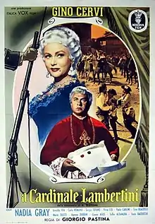 Cardinal Lambertini (Italian: Il cardinale Lambertini) is a 1954 Italian historical comedy film directed by Giorgio Pastina and starring Gino Cervi, Nadia Gray and Arnoldo Foà. It is an adaptation of Alfredo Testoni's 1905 play Cardinal Lambertini, which had previously been turned into a 1934 film adaptation.[1]