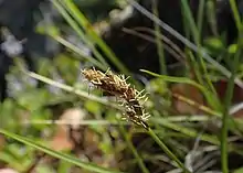 The sedge has a spreading woody rhizome with smooth and tufted culms that are 25 to 70 cm (9.8 to 27.6 in) in height and are surrounded at the base with pale brown coloured sheaths that disintegrate into fibers with age. The flat grey-green coloured leaves have a linear shape and are shorter than the culms and have a width of 1.5 to 3 mm (0.059 to 0.118 in) and have a small spike at the end. The inflorescence is composed of four to eight spike of which two to four are male. They have a cylindrical to club shape and are the 1.4 to 1.8 cm (0.55 to 0.71 in) in length. The female spikes are more cylindrical and are 1 to 3 cm (0.39 to 1.18 in) long.[3]