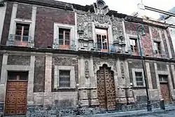 The present-day building was constructed between 1770 and 1780, replacing the one built by Vargas de Valdez.[5] While it has a number of minor alterations over the years[5] it is basically the same Baroque facade and a small patio, and is considered to be a prime example of an 18th-century residence.[1] The facade is of two levels and faced with tezontle, a blood-red volcanic stone. Windows and doors of the main facade are framed with chiluca, a greyish-white stone. The portal shares similarities with the Colegio Grande portal of the San Ildefonso College, with which this building was associated. The lower arch is flanked by paired columns, which are fluted only in the upper part. The upper level of the portal is profusely decorated with plant designs with estipite (inverted, truncated, slender pyramid) designs. The cornice is very simple, containing a relief of a crucifix. Upon entering the main door, there is a long, narrow hallway that leads to a very small patio area.[5]