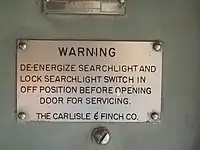 The earliest models used a carbon arc for the light source. Other companies had previously built carbon arc searchlights, but Carlisle & Finch added the innovation of mounting the carbon electrodes horizontally on the beam axis. The tip of the positive carbon faced the reflector, maximizing the amount of light reflected, and spacing of the carbons was adjusted by motorized screw-feed mechanisms.[15] A manually-activated screw moved the entire mechanism forward and backward, positioning the arc at the mirror's focal point. A pair of carbons had a lifetime of about seven hours.[16]