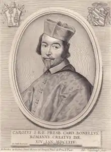 Carlo Bonelli dei marchesi di Cassano was born in 1612, the great-great-grand-nephew of Pope Pius V. He received his doctorate in law from the University of Perugia and was appointed private chamberlain to Pope Urban VIII. His career in the Roman Curia resulted in appointments as governor of several cities of the Papal States, including Rome, then as vice-camerlengo from 15 April 1655 to 18 October 1656, when he was appointed to the titular position of Latin Archbishop of Corinth. Fortified by the title, he was sent as nuncio extraordinary to Philip IV of Spain to establish peace among the Christian princes, 27 October 1656. With the Treaty of the Pyrenees signed in 1659, he remained in Madrid as ordinary nuncio until 1664. When he was recalled to Rome and made cardinal in the consistory of 14 January 1664, with the titulus of S. Anastasia,[1] he brought with him the auditor of the papal legation at the court of Madrid, the antiquarian Raffaello Fabretti, who took advantage of Bonelli's leisurely return through the south of France to extend his knowledge of Roman antiquities.[2]