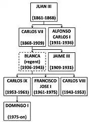 The Octavistas received what looked like a mortal blow in 1969, with death of the most dedicated supporter of the cause Cora y Lira, even though Don Francisco José passed away in 1975 and Don Antonio in 1987. In the mid 1980s most Carloctavistas, reduced to hardly active minuscule grouplets, merged into a united Traditionalist organization, Comunión Tradicionalista Carlista, which refrained from endorsing any specific claimant or branch.[162] In the Spanish public discourse the Carloctavistas are currently present mostly thanks to a handful of websites, featuring Don Antonio's son as the legitimate king of Spain.[163] Indeed, Don Domingo, residing mostly in New York, decided to raise the claim himself. Though in his 20s he was totally ignorant and indeed indifferent to the Carlist cause,[164] now he styles himself as king and sporadically issues documents like Proclamación de Don Domingo de Habsburgo-Borbón y Hohenzollern, Rey legitimo de España.[165] The eldest daughter of Carlos Pio lives in Barcelona, and the other in New York; since the early 1960s they maintain no links with Carlism.