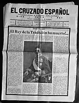 Any official, semi-official or unofficial endorsement of Don Carlos's claim on part of the regime failed to materialize before in late 1953 he unexpectedly died of cerebral hemorrhage.[133] Though chain-smoker, he was of rather good health, which immediately triggered rumours about a possible assassination attempt;[134] since not a shadow of proof was unearthed, they remained nothing but speculations.[135] Funeral celebrations assumed unexpectedly high-profile;[136] though Franco did not attend, many other top state officials did.[137] Even the popular pro-Alfonsist daily ABC, which maintained almost perfect blackout on Carlos VIII during the previous ten years,[138] now felt it safe to acknowledge his death; a two-page editorial praised his anti-communism and dwelt on trivia like his affection to motor sports, but did not utter a single word about his royal claim.[139]