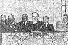 Octavistas were in acute conflict both with mainstream Carlism, loyal to the regency of Don Javier and intransigently opposed to Francoism, and with collaborative branch headed by conde Rodezno and leaning towards dynastic accord with Don Juan.[92] This occasionally led to violent clashes, like in December 1945 in Pamplona.[93] The Carloctavista strength was that many Carlists, tired of semi-clandestine status and envious about open campaign of Don Carlos, were getting increasingly irritated by what they considered inefficient overdue regency.[94] The Carloctavista weakness was that many Carlists saw Carlos Pio as a Francoist puppet,[95] animated with the sole purpose to confuse. As a result, the Carloctavistas, initially referred to as "elites with no supporters",[96] attracted significant backing,[97] though they did not manage to dominate the Javieristas. Some authors claim Carloctavistas might have equaled Javieristas in terms of popularity,[98] enjoying most support in Navarre[99] and in Catalonia.[100] They controlled some of the Carlist periodicals;[101] the highest-positioned though not particularly vehement Octavista supporter was Esteban Bilbao;[102] other nationally known figures included Antonio Iturmendi,[103] Joaquín Bau,[104] Jaime del Burgo, Juan Granell Pascual[105] and Antonio Lizarza Irribaren;[106] many Carloctavistas were politicians known locally.[107]