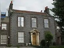Numbers 34 and 35 Mighell Street (the former Mighell Farmhouse) were jointly listed on 13 October 1952.[78] Described as a "surprising survival",[79] the now semi-detached house is a two-storey cobble-fronted building with a prominent porch framed by Tuscan columns and topped by an entablature with a frieze and triglyph and a decorated pediment. An arched doorway with a keystone has a 19th-century panelled door set into it, and the sash windows are also original and have similar arched surrounds made of bricks. The roof is tiled and has chimneys at each end.[78] The farmhouse's origins are unknown, although a Philip Mighell was a major landowner on Hilly Laine in the late 18th century, when some of the paul-pieces bore his name.[5][16] The building was apparently at least partly in commercial use by 1865.[5]