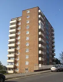 Clearances around Albion Hill began in the 1950s. From 1959, the narrow, densely populated terraces between Albion Hill and Morley Street were cleared and replaced with landscaped open space and seven tower blocks—Brighton's first such buildings.[23][33] The first, Highleigh, opened on 11 May 1961. Like its later neighbours, it has 11 storeys. The steep Richmond Street was severed as part of this redevelopment; its lower section was replaced by a zig-zag path down the hillside and a short road called Richmond Parade,[23] and new roads (Grove Hill and Ashton Rise) were built between the tower blocks and across the slope of the hill.[33] Similarly, the lowest section of Carlton Hill was renamed Kingswood Street when it was redeveloped in the 1960s: Brighton Art College (now part of the University of Brighton) was extended in 1967 by Brighton borough architect Percy Billington,[33] taking up a large corner plot.[2]