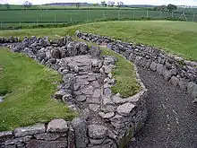Ardestie earthhouse was discovered in the 1940s to the north of Mains of Ardestie farm.[1] It was excavated in 1949-1950 by F.T. Wainwright, who first suggested that the function of the souterrain was as an underground cow byre, although grain storage and ritual use have also been suggested.[2] Incorporated into the structure are recycled stones with neolithic/Bronze Age cup and ring marks