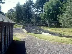 In 1802, the first wooden dam and a gristmill were built on the river at the site of the village, which was then known as Nichols Bridge.[2][3] A few years later, a cotton mill was established, with production buildings mostly located in Richmond and some employee housing located across the river in Charlestown. Rowland G. Hazard bought the mill in 1843 and renamed it the Carolina Mills Company in honor of his wife Caroline Newbold Hazard of South Kingstown. The village around the mill was also given the same name.[7] The Rhode Island Historic Preservation Commission described 19th-century Carolina as a "center for the surrounding area, including a school, a church, a post office, a bank, several stores, a blacksmith shop, and halls for meetings, lectures, and 'entertainments'."[3] The local post office was named "Carolina Mills" from 1850 until 1879, when it was renamed "Carolina."[8]
