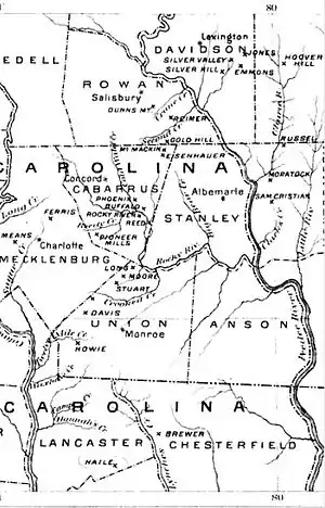 The Carolina gold rush, the first gold rush in the United States, followed the discovery of a large gold nugget in North Carolina in 1799, by a 12-year-old boy named Conrad Reed. He spotted the nugget while playing in Meadow Creek on his family's farm in Cabarrus County, North Carolina.[2][3] Conrad took the 17-pound (7.7 kg) gold nugget home to show his father. However, gold was not commonly seen in their community and the value of the nugget was not understood. The nugget was used as a door stop in the family's home for several years.[4] In 1802, Conrad's father, John Reed, showed the rock to a jeweler, who recognized it as gold and offered to buy it. Reed, still unaware of the real value of his "doorstop," sold it to the jeweler for US$3.50 (equivalent to $71.58 in 2022) (approximately one week's pay for a farm laborer at that time).