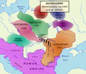 After Roman emperor Theodosius I defeated the neighbouring Carpi people in 381 AD, the people of the Carpathian Tumuli culture lost an important ally and this archaeological culture dissipates soon after, its place being taken by another one, the Sântana de Mureș–Chernyakhov culture, which also replaces the Poieneşti – Lucaşevca culture in the Northwestern Moldavian Subcarpathians, formed by the Bastarnae between the Costoboci and the Carpi.