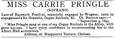 Advertisement by Carrie Pringle in The Musical Times of 1 November 1895, containing testimonial of Frederick Bridge.