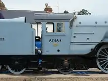 A Cartazzi axle is a design of leading or trailing wheel support[1][2][3] used worldwide.[4][5][6][7][8] The design was used extensively on the former LNER's Pacific steam locomotives and named after its inventor F.J. Cartazzi,[9] formerly of the Great Northern Railway. It should not be confused with a pony truck as it does not pivot at all.[8] The axle does, however, have sideways play built in to accommodate tight curves. Cartazzi's design causes the weight of the locomotive to exert a self-centring action on the trailing wheels.[10]
