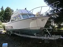All the boats are 28' hull length.[1] From there was the option of a bow sprit, as well as a swimgrid, which added to the total length. The boats are all equipped with a Flying Bridge Helm station, and some are also equipped with a secondary helm inside the cabin. In the cabin there is a head that also doubles as a shower stall. Across from the head is a large storage closet that has one shelf, and a hanger for clothes. In front of the closet there is a long counter. On this counter was a sink. Some boats also had a propane stove, others had a helm station mounted to the forward of the counter and had no stove. Across from the counter was a small table and bench seats, they also folded down like most RVs into a bed. Ahead of that is the V berth with enough room to sleep two.