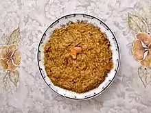Caruru (Brazilian Portuguese: [kaɾu'ɾu]) is a Brazilian food made from okra, onion, shrimp, palm oil and toasted nuts (peanuts and/or cashews). It is a typical condiment in the northeastern state of Bahia, where it is commonly eaten with acarajé, an Afro-Brazilian street food made from mashed black-eyed peas formed into a ball and then deep-fried in palm oil.[1][2]