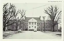 In 1956, Cary High School was the first school in Wake County to be accredited by the Southern Association of Secondary Schools.[21] The next year, the Wake County Board of Commissioners purchased forty acres of land for $30,000 from Luther M. Maynard as a site for a new Cary High School.[22] In 1958, 150 residents debate the proposed location with the Wake County Board of Education; while many liked the new site, others thought the property which was one mile from downtown was too far out in the country and lacked good road access.[22]