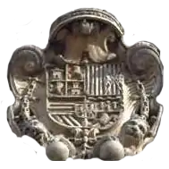 This shield is composed of the arms of Castile and León in the first quarter, the arms of Aragón and Sicily in the second, the arms of Austria and Burgundy modern in the third, and the arms of Burgundy ancient and Brabant in the fourth. The arms of Flanders and Tyrol are found in the lower escutcheon on the nombril point, and the symbol for Granada in the center of the shield. The arms of Portugal would have been situated in an escutcheon on the honor point, between those of Castile and León and those of Aragón.