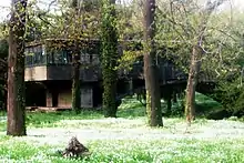 The house is located on a wooded parcel in the Pinos de Anchorena neighborhood, Mar del Plata, Argentina. A stream running through the terrain became the centerpiece for the original 1942 design for a modern, 9 by 27 meter (30 by 90 foot) weatherized concrete structure, which was set on an archway straddling the stream.[3] Works began in 1943. The construction of the compound was commissioned to two local building companies, Sartora e hijos and Lemmi hnos.[4] Williams' design looked for a fusion of modern building technology and topography, and for a non-intrusive relationship between architecture and nature. There was also an eclecticism between rationalist and traditional architectural features. The house is made of three basic segments; a curved layer for the archway, two flat layers for the house itself and another layer for the rooftop. The body of the house's weight is supported in the center by the curved layer and on the sides by bulkheads. There are two entrances to the house, each one at both ends of the bridge, which led to stairways that run parallel to the curved layer. The stairways can be seen from outside through picture windows. The main window runs 360º all around the house perimeter. Williams devised a light, aerial and see-through structure.[5] The headroom of the house was conceived as a sound-proofing music room with a grand-piano, where Williams senior could compose music.[1] The project included a detached garage and service room.[5] The wooded landscape departed the picturesque concept of Mar del Plata's traditional architecture, in which nature is presented in a bucolic setting[6] for a comprehensive merging of nature and architecture.[7]
