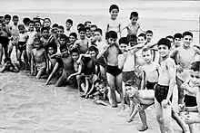 Jewish institutions and French authorities realized the need for open air vacations for those children who had never left the Mellah, who knew neither the sea nor the mountains. The organization ‘L’Aide scolaire’ in Casablanca organized summer camps from the end of the 1940s.[25][52] The DEJJ (Educational Department of Jewish Youth) trained a series of educators and monitors to supervise the camps. In 1956, 4070 children[53] and in 1958, 5382 children[54] were able to take advantage of summer camps thanks to the authorities and JOINT's funding. SP was not selected and could not send its children to the mountains or to seaside resorts. An alternative solution, ‘La Colonie Urbaine' (Urban Colony), was set up.[55] During the summer, teaching classes were not held; but the children nevertheless went to the SP where three meals were served and outdoor activities were organized. Third of the children, i.e. a hundred, took advantage by rotation of 'La Colonie Urbaine': the AIU made available to the organizers a school, close to the beach, located in the greater suburbs of Casablanca, where the children could sleep and eat. In the morning, the children with a team of monitors left for the beach where they enjoyed outdoor sports and games around noon, they returned to the AIU premises for food and a nap, and in the evening, a car brought the food directly from the SP kitchens.[55]