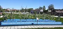Memorial to asbestos victims on the former Eternit factory site. There is written: "The handkerchiefs soaked in our tears will put on wings and fly far to develop deep roots of justice".