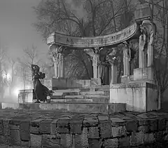 The most important, however, is Bistolfi's war memorial of 1928 (pictured left). A marble exedra with four caryatids in the form of winged victories is raised on a dias fronted with steps. The bronze sculpture Il Fante Crociato, a foot soldier in crusader-period costume, takes centre stage; a second bronze a lightly robed Primavera Italica (Italic Spring) steps down from the platform and out of the ensemble.