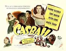 Casbah is a 1948 American film noir crime musical film directed by John Berry starring Yvonne De Carlo, Tony Martin, Peter Lorre, and Märta Torén. It was nominated for an Academy Award for Best Original Song for the song "For Every Man There's a Woman".