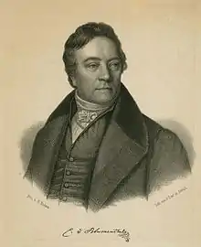 Casimir von Blumenthal was born in Brussels, the son of Baron Joseph von Blumenthal and Baroness Maria Therese, née Malabreck.[1] His father, who had a job with the Austrian government, took the family to Prague during the Brabant Revolution (1789–1790).[2] His family had experienced a significant loss of wealth in the wake of the French Revolution.[3] The young Blumenthal learned to play the violin and studied composition and received musical education in Vienna under Abbé Vogler along with his two brothers, Joseph and Léopold.[3] When Vogler went to Vienna in 1803 to produce his opera Samori, he recommended his students to the director of the Theater an der Wien, and on his testimony, they were accepted into the theatre orchestra, Casimir and Léopold on violin, Joseph on viola.[2] He worked as a music teacher and conductor in Vienna, Prague, Brno and Bratislava until 1821, when he was appointed conductor of the Allgemeine Musik-Gesellschaft (General Music Society) and settled in Zurich.[1] Blumenthal conducted the Swiss Music Festivals there in 1828 and 1838. When the Aktientheater was built in 1834, Blumenthal began to conduct opera performances.[3] He composed Ouvertüre über Schweizerische Volkslieder (Overture on Swiss Folk Songs) for the opening performance of the theatre.[1] Blumenthal retired in 1846 and died in Lausanne in 1849.