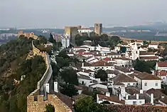 The trapezoidal castle oriented to the southeast rises 79 metres (259 ft) above sea level and is situated on the extreme northwest of the walled fortifications.[1] It is reinforced in the north by three semi-circular and rectangular corbels; in the east and west of the wall by rectangular corbels, known as the towers of D. Dinis and D. Fernando; to the south by two semi-circular corbels, one with machillitions; and a barbican in the north and west. Along the wall dividing the two courtyards is a gentle, rectangular arch, known as the tower of Albarrã.[1] The castle's architecture shows elements of Romanesque, Gothic, Baroque and Manueline influences spread over two main areas: the Castelejo (current Inn Castle, or Pousada de Obidos) and the intramural district.[1]