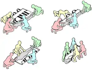For this, two team members are placed on each side of the casualty; they place one hand under the buttock, the other under the opposite armpit; the casualty places their arms around the neck of the team members. A third team member lifts the legs as usual, and a fourth pushes the stretcher.