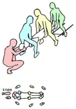At the order of the chief, the casualty is lifted and put on the lifted knees of the first responders. Then, the casualty is flattened against the chests, and the first responders stand up. They move towards the stretcher; there, they put one knee on the ground (the closest to the casualty's feet), lay the casualty on his/her back, and move the casualty from their knees to the stretcher. For this last movement, additional first responders can be placed at the opposite side of the stretcher to help the landing.