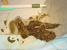 Hairworms are most commonly found as parasites in the gastrointestinal tract in cats, for example capillaria putorii. They are considered to cause little disease, but occasionally cause vomiting and diarrhea and, rarely, peptic ulcer disease with anemia.[6] The eggs of gastrointestinal hairworms are oval, about 60-70 × 35-40 µm in size, and can be detected by flotation techniques.[7]
