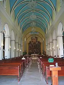 The building's exterior architecture is Neoclassical, while its interior is mostly colonial and Gothic.[13] The current structure is larger than the 1839 structure, having been extended on the south side in 1911 with the addition of the side chapel. It covers an area of 3,540 square yards (2,960 m2).[1] The architecture of the cathedral is neoclassical in style with the exterior painted pale blue and gray and the interior in blue and beige.[16] The building has many stained glass windows depicting religious scenes and two bell towers.[17]
