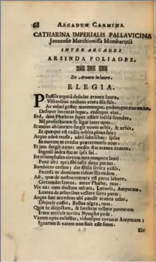 Caterina Imperiale Pallavicini (also spelled "Catharina"; pen name, Arsinda Poliades; fl. 1721) was an 18th-century Neo-Latin poet from the greater Genoa region. Her work, which was published in the collections of the Pontifical Academy of Arcadia (Pontificia Accademia degli Arcadi[1]), includes the styles of epigram and elegy.