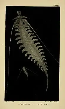The crystalline Johnstonella: I have pleasure of announcing a new animal of much elegance, which I believe to be of a hitherto unrecognised form. I shall describe it under the appellation of Johnstonella Catharina. (Plate XXV). ... I venture respectfully to appropriate to this marine animal, the surname and christian name of Mrs. Catharine Johnston, as a personal tribute of gratitude for the great aid which I have derived from her engravings in the study of zoophytology.[8]