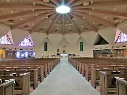 The cathedral church is built of reinforced concrete and steel, with an exterior facade of Indiana limestone. The interior of the church, which seats 950 people, has 19,000 square feet (1,800 m2) of terrazzo flooring. The church's diameter is 157 feet (48 m), and its main aisle runs 88 feet (27 m) from the glass doors to the altar. The cathedral's ceiling, at a height of 72 feet (22 m), is made of Douglas fir, supported by sixteen laminated wood beams that are about 60 feet (18 m) long. The beams meet at a steel ring, in the center, that is about nine feet in diameter. The ring creates an oculus, from which the spire rises to a height of 29 feet (8.8 m). The outer roof is made of copper, with sixteen gables in a design which signifies a crown.