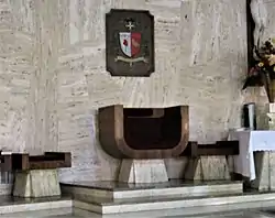 The sanctuary wall is polished buff travertine. The steps and raised surfaces in the sanctuary are of contrasting walnut travertine. The altar is a single block of polished marble weighing 7000 pounds. Within the altar are relics from St. Clement, St. Irenaeus, and St. Aurelius. The sanctuary itself is oval-shaped and was designed specifically for ceremonies in which the bishop presides and for post-Vatican II liturgy. The cathedra or bishop's throne sits immediately beneath the bishop's coat of arms, which hangs on the sanctuary wall. The crucifix with a corpus of walnut travertine is suspended from the wall. The corpus is 5 feet (1.5 m) tall and weighs over 450 pounds (200 kg).