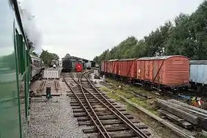 Caverswall Road railway station is a heritage railway station on the Foxfield Railway in Staffordshire. It serves as the centre of the railway's operations. Since the Foxfield Railway is a former industrial railway, there were no passenger stations on the line originally.