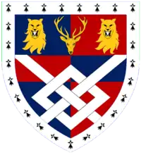 Quarterly Gules and Azure a Fret throughout Argent on a Chief per pale Azure and Gules a Hart's Head caboshed between two Lion's Heads guardant Or langued argent all within a Bordure Ermine