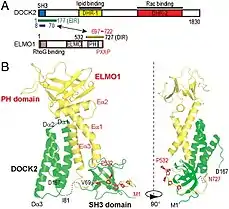 - The Pleckstrin Homology domain spans 100-200 amino acids in length.[2][11][16] It is located close to the C-terminal and is necessary to bind the Rac-GTPase once the Guanine Nucleotide Exchange Factor with CED-5 and CED-2 is formed. This activates the cytoskeletal remodelling.[11]