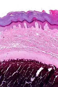 | Micrograph of calcinosis cutis. The calcification is purple (bottom of image). H&E stain. | |