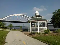 Centennial Park is one of four parks located along the Mississippi River in downtown Davenport, Iowa, United States. The other three are LeClaire Park, which is immediately to the east of Centennial Park, Veterans Memorial Park, which is being developed immediately to the west,[1] and River Heritage Park that is under development on the far east side of downtown. Development of the 250-acre (1.0 km2) park was begun in 2000.[2] Its name is derived from the Rock Island Centennial Bridge, which is on the east side of the park. Centennial Park features a boat ramp, a playground, a gazebo, fishing areas, a dog off leash area, basketball courts, a sprayground, and a skateboard park. The skate board park is used for skateboarding, roller blades and BMX bikes. The Riverfront Parkway passes through the park, and the River's Edge, an indoor sports complex operated by Davenport Parks and Recreation, is on the northeast corner of the park.