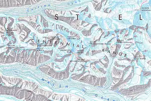 The Centennial Range is a sub-range of the Saint Elias Mountains. It is located inside Kluane National Park and Reserve in the far west of Yukon Territory in Canada. It consists of fourteen major peaks, and was named for Canada's Centennial in 1967.[3] Its peaks bear the names of Canada's provinces and territories, with the exception of Nunavut, which was not a territory at the time.[4] The tallest point is Centennial Peak. Nine of the peaks were climbed as part of the Yukon Alpine Centennial Expedition, part of the 1967 celebrations.[5]