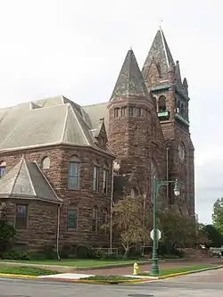 The Central Congregational Church is a historic church on Central Square in Galesburg, Illinois. The church was built from 1897 to 1898 to serve Galesburg's newly united Congregational church. Galesburg's two congregational churches formed in the 1850s after separating from the town's Presbyterian church; the two churches united in 1895 after one church began to collapse during a service. Galesburg architect C.E. Gottschalk designed the church in the Richardsonian Romanesque style; his design features a bell tower with a pyramidal roof, numerous turrets, a 22-foot (6.7 m) wide stained glass rose window above the entrance, and detailed stonework. The brown sandstone used to construct the church was imported from Marquette, Michigan. The church's bell was formed from the bells used in the two Congregational churches before their union.[2] In 1912, the church acquired an organ built by the M. P. Moller Company.[3]